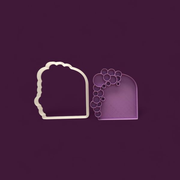 Cortador e marcador arco ou moldura bolha. Pode ser usado em pasta americana e massa para biscoito. Produzido com PLA, material de origem natural (amido de milho, entre outros), o que o caracteriza biodegradável.