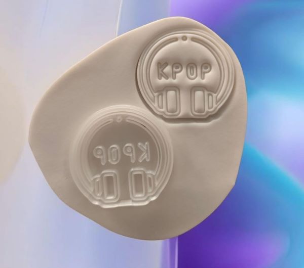 Cortador e marcador fone de ouvido K POP. Pode ser usado em pasta americana e massa para biscoito. Produzido com PLA, material de origem natural (amido de milho, entre outros), o que o caracteriza biodegradável.