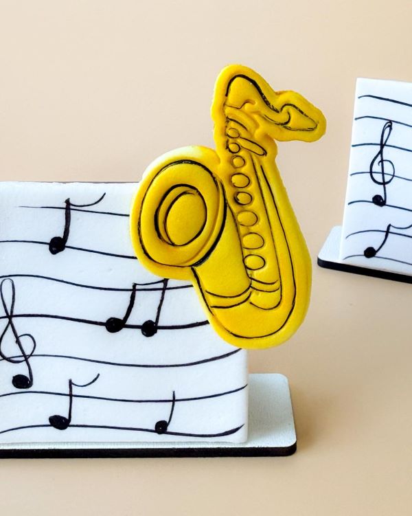Cortador e marcador de saxofone instrumento musical, pode ser usado para pasta americana. Produzido com PLA, material de origem natural (amido de milho, entre outros), o que o caracteriza biodegradável.